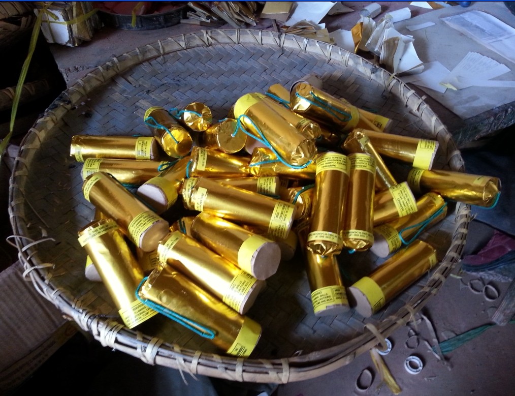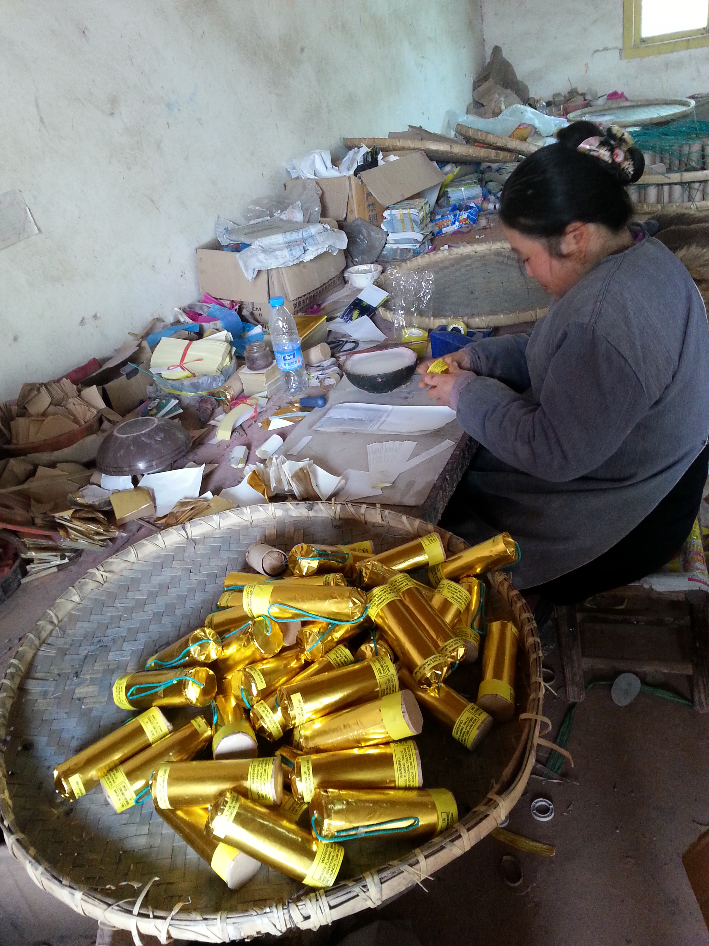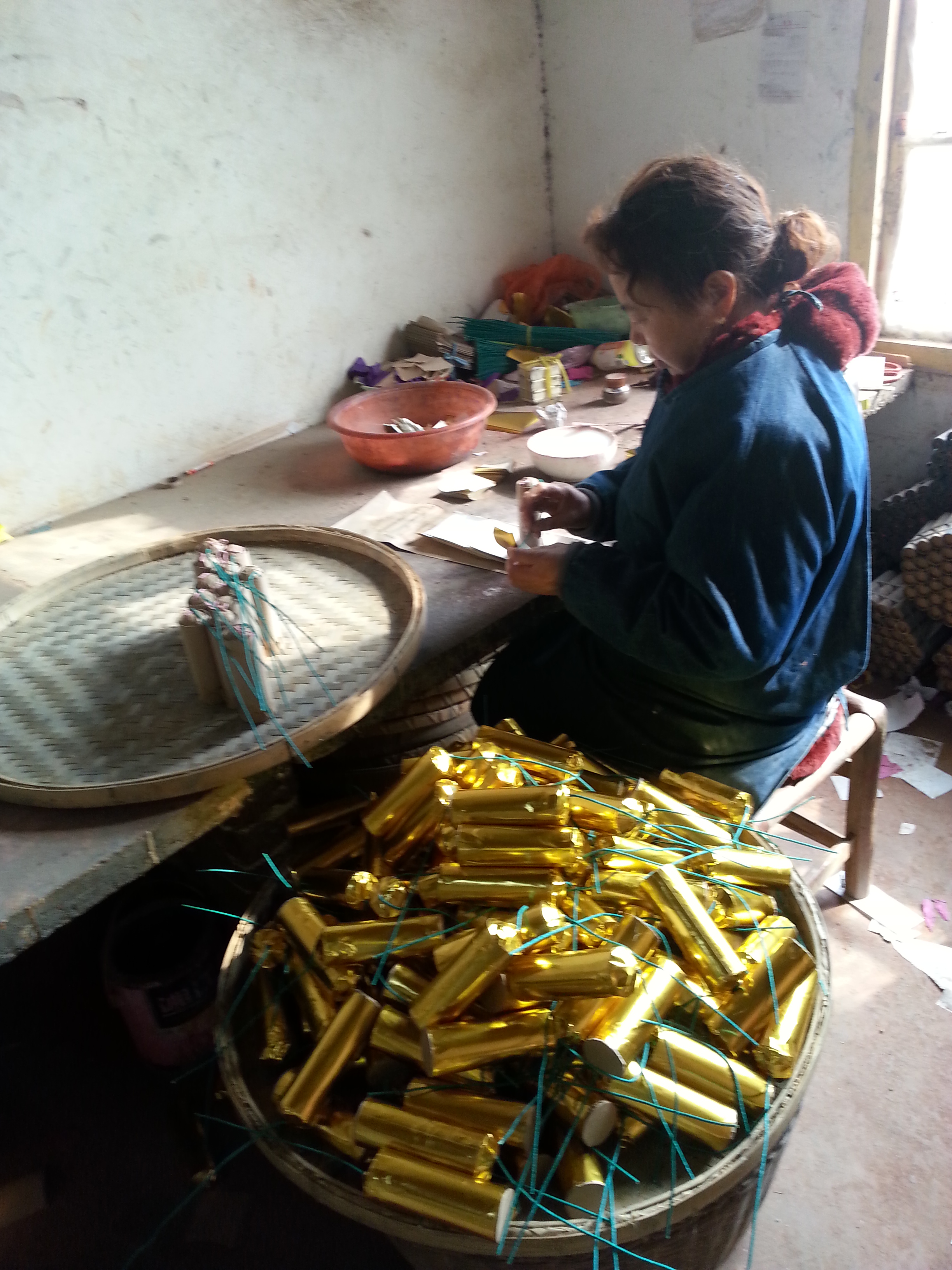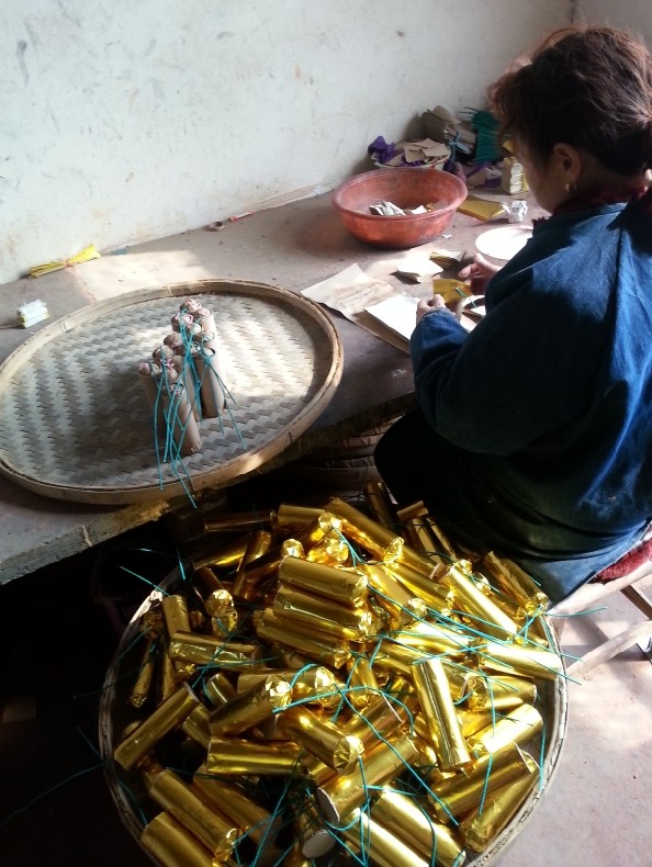 Dunpai fireworks factory workers packing reloadable Artillery with assortment.