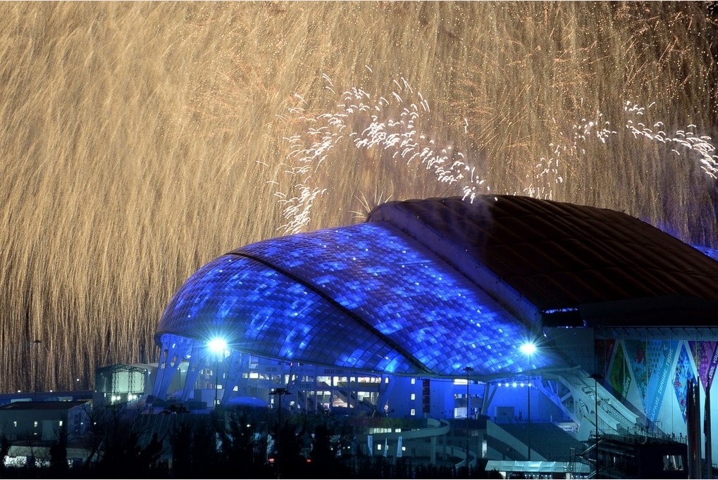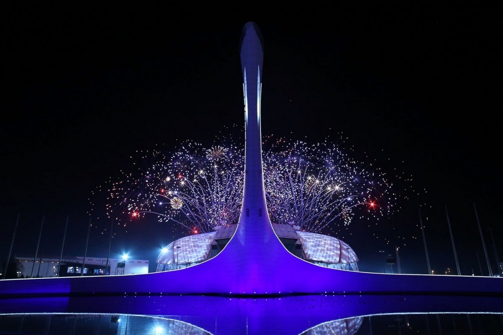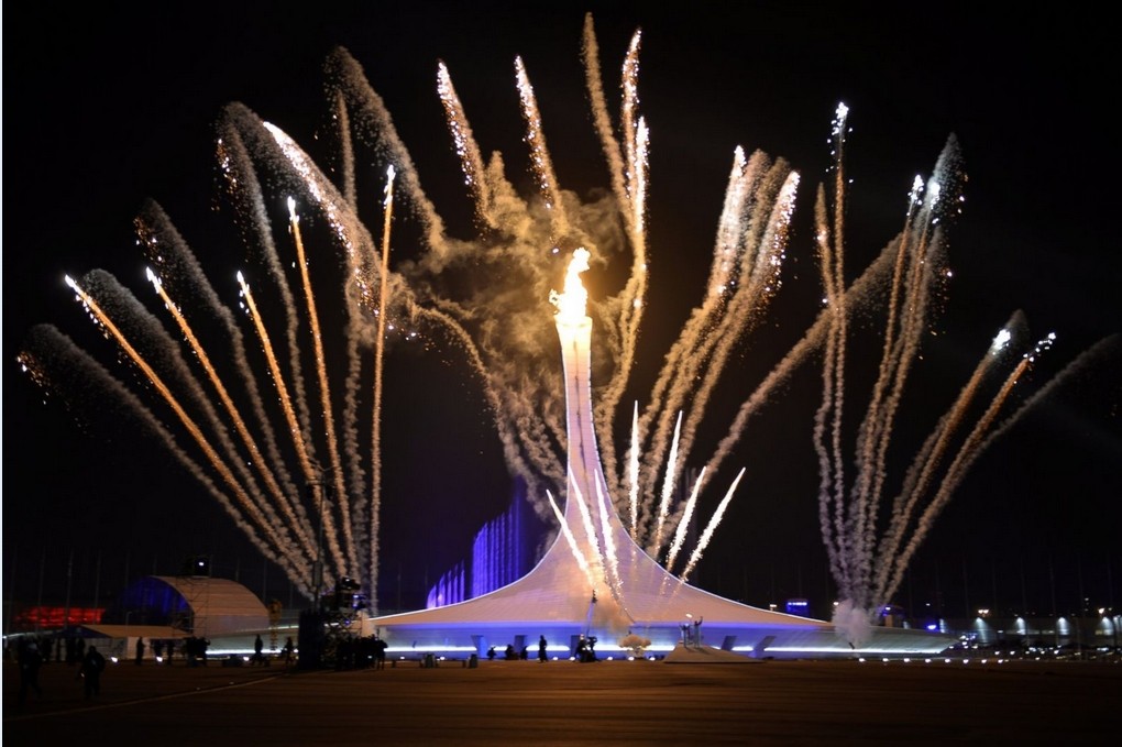 Fireworks display explode behind the Olympic flame cauldron during the Opening Ceremony of the Sochi Winter Olympics on February 7, 2014 in Sochi.