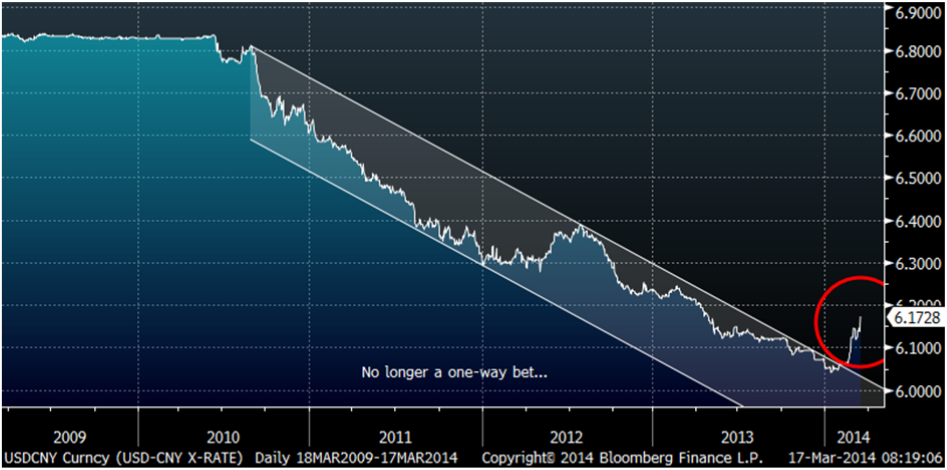 The coincidence of the recent depreciation and the increase of the daily trading band from 1% to 2% is not directly linked.  Some assume that the change in the daily trading band is what caused the depreciation.  This is not true.  China’s government still fully controls the RMB exchange rate.  So the daily trading band has nothing to do with the actual rate, other then a larger band means the government can change the currency even faster.